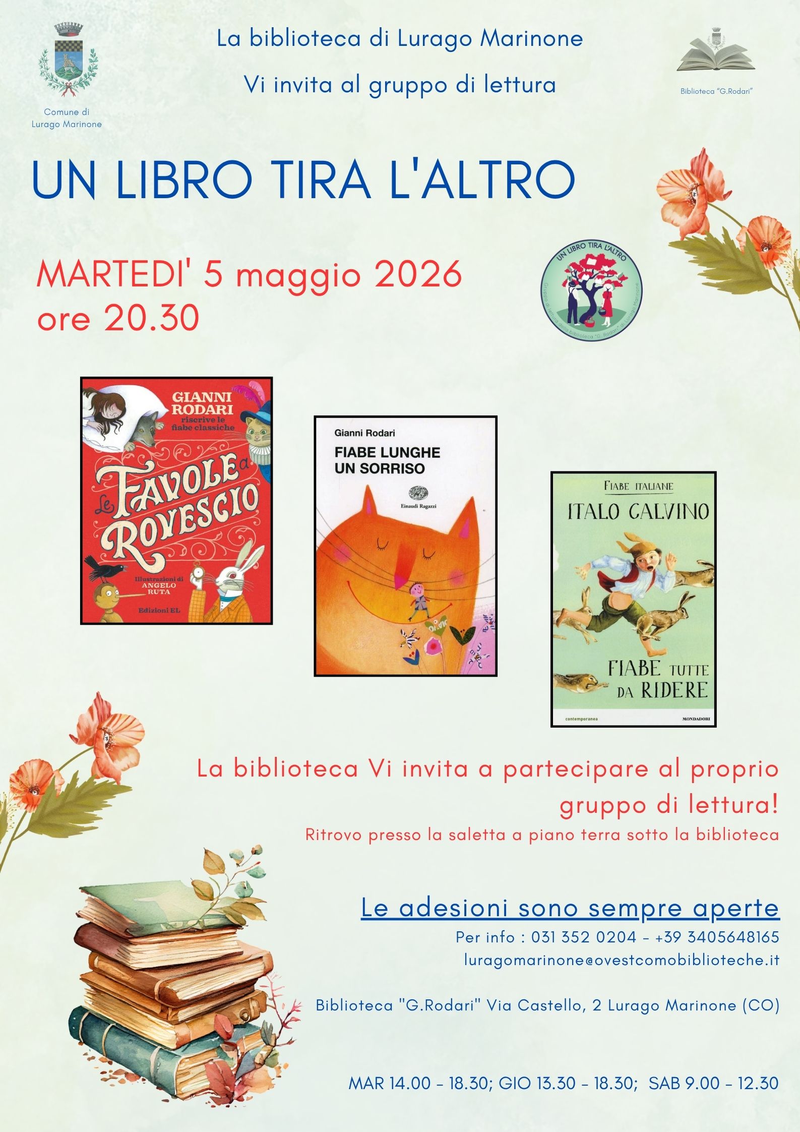 Appuntamento con il Gruppo di lettura "Un libro tira l'altro" martedì 5 maggio 2026 alle 20.30 per parlare del libri scelti questo mese (li trovate in locandina), legati al mondo delle fiabe e delle favole.